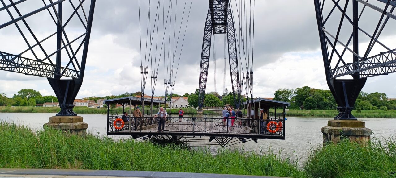 Enfin, visite du pont Transbordeur sur la Charente, le seul en activité en France,(il y en a 8 dans le monde),construit par Ferdinand Arnodin, en 1900 (27 mois de travaux),avec 2 pylônes en métal de 66,25m de haut, un tablier de 175,50m de long à 50m de hauteur, pouvant porter 26 tonnes, réservé aux vélos et piétons depuis sa restauration. Le trafic routier a emprunté en 1967 un pont à travée levante, aujourd’hui démoli et remplacé par un viaduc à 2 fois deux voies.